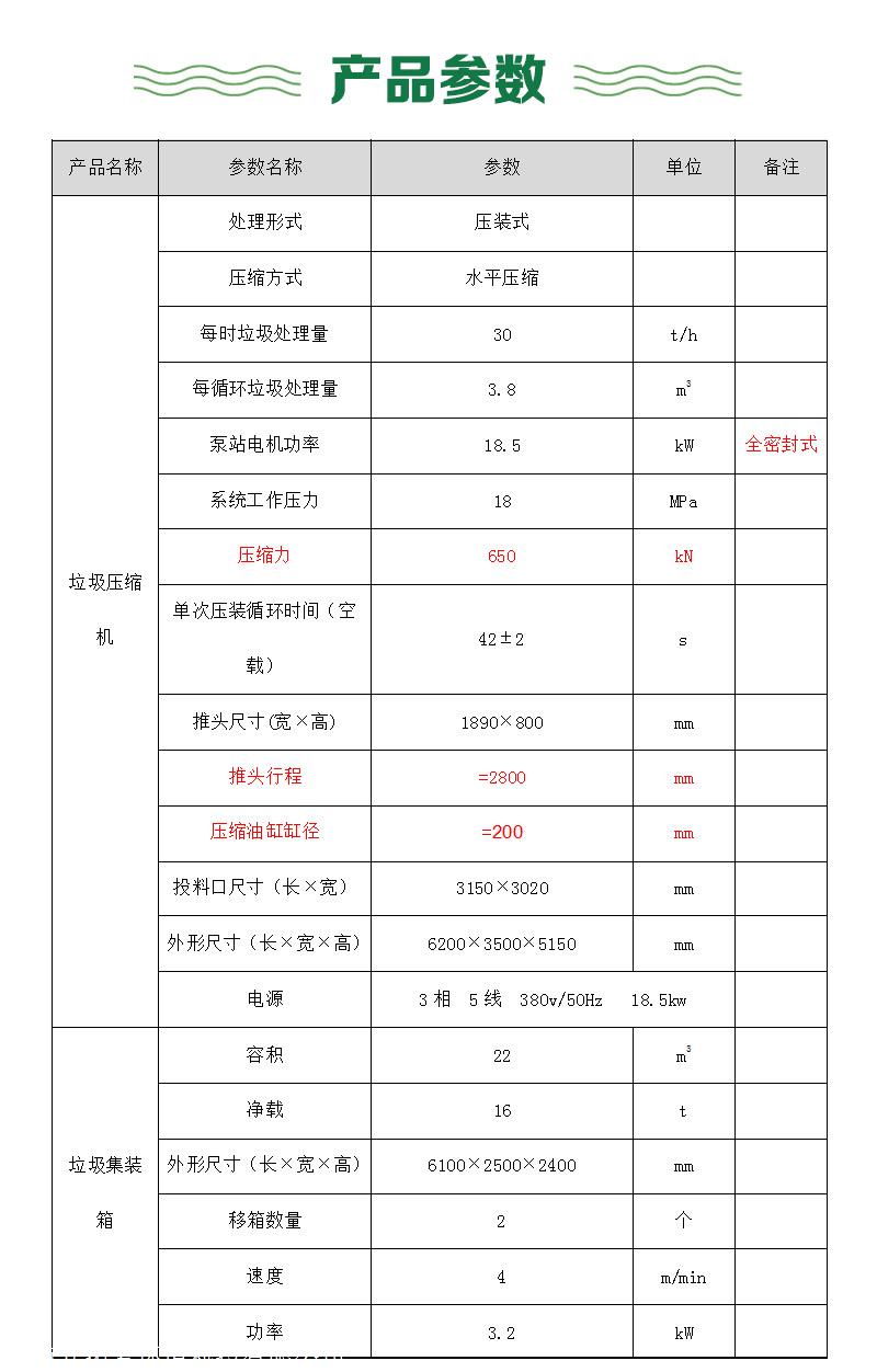 压缩推头的设计综合考虑了压缩推头的工作截面积和挤压油缸的推力,单位面积压缩力大,垃圾压缩效果好。