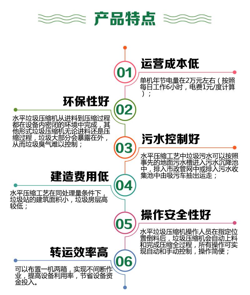 5、操作安全性好,水平垃圾压缩机操作人员在设定位置倒料后,垃圾压缩机会自动上料和完成压缩全过程,所有操作可实现自动和手动控制,操作简便;其他方式特别是有2米多深地坑的倒料及装车的垃圾处理工艺,人员操作时需格外小心;