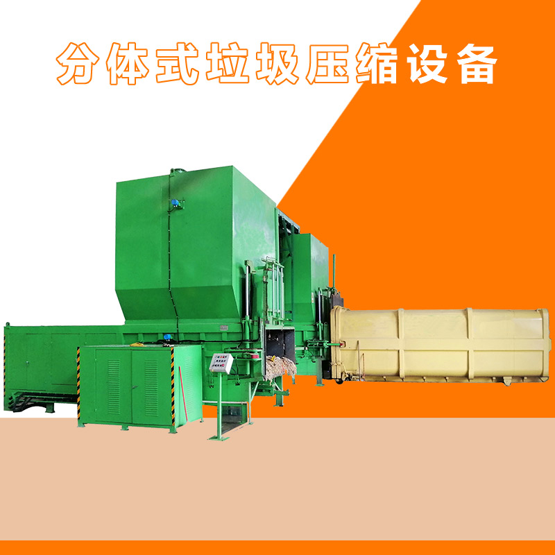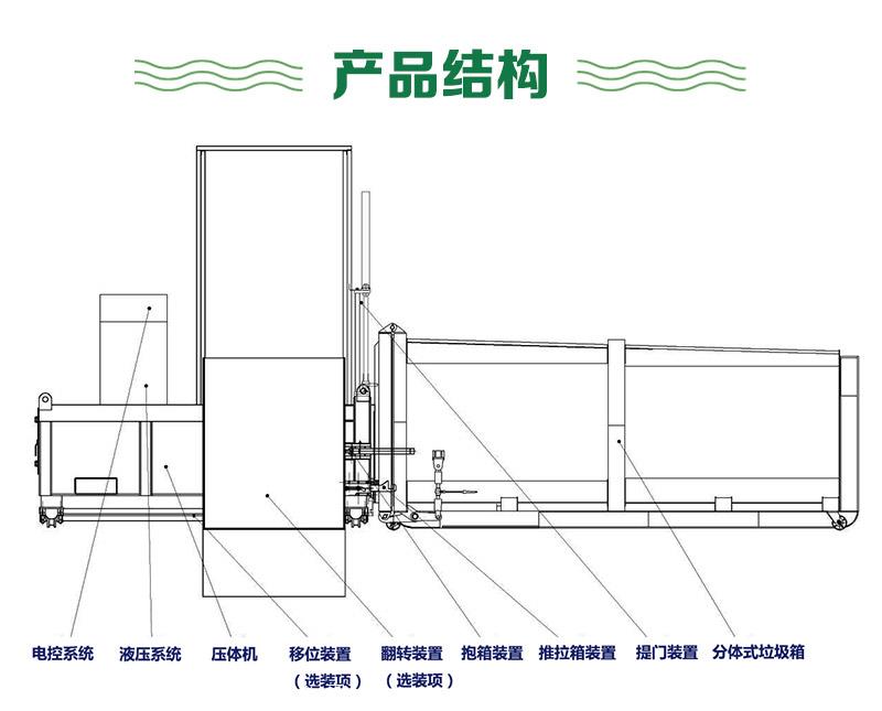 斜压式垃圾压缩设备由垃圾压缩机、垃圾集装箱、移箱平台、垃圾转运车等组成;垃圾转运车为转运用大型车厢可卸式垃圾车。
